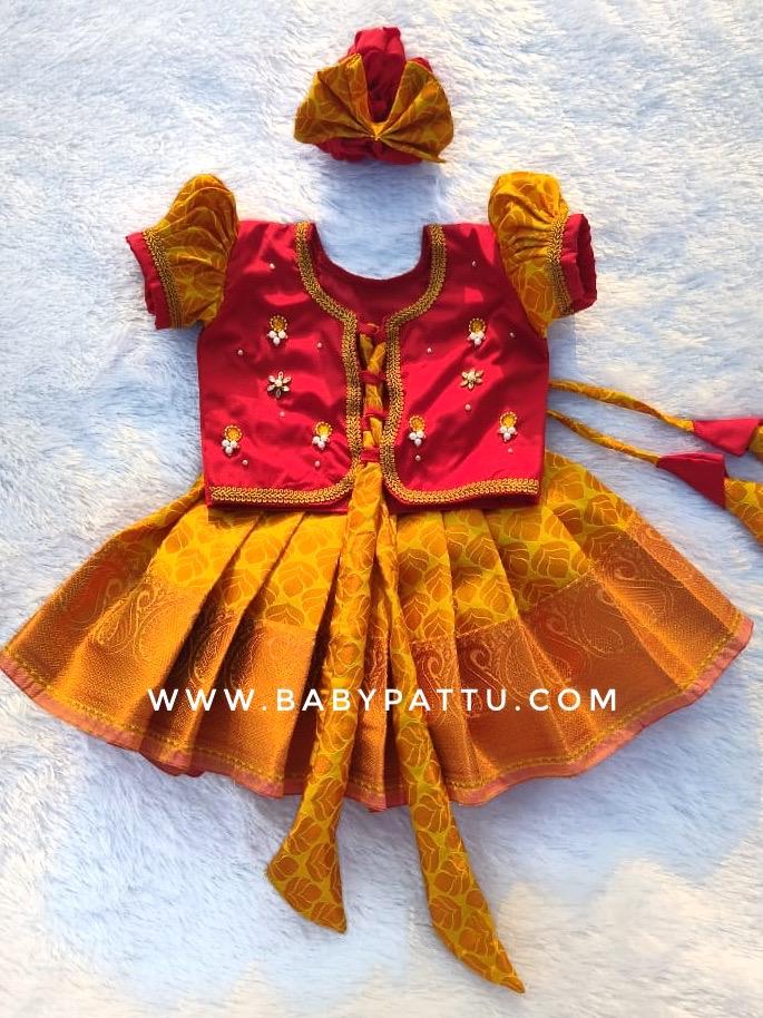 Pattu Pavadai is a traditional dress of South India. The paavadai or langa is a cone-shaped, long skirt that is pleated and tied around the waist, normally made of silk, that hangs down from the waist to the toes.