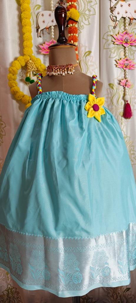 Pattu Pavadai is a traditional dress of South India. The paavadai or langa is a cone-shaped, long skirt that is pleated and tied around the waist, normally made of silk, that hangs down from the waist to the toes.