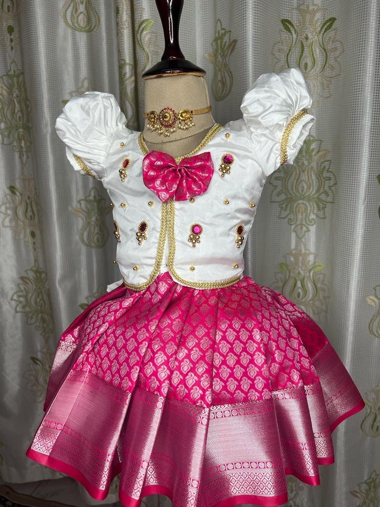 Pattu Pavadai is a traditional dress of South India. The paavadai or langa is a cone-shaped, long skirt that is pleated and tied around the waist, normally made of silk, that hangs down from the waist to the toes.