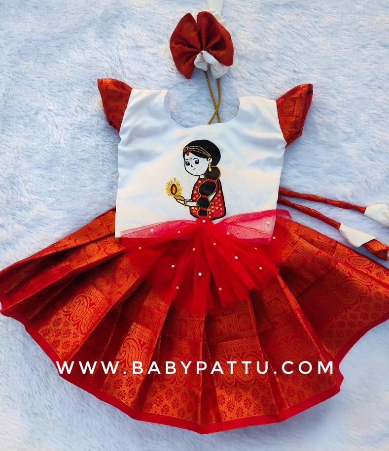Pattu Pavadai is a traditional dress of South India. The paavadai or langa is a cone-shaped, long skirt that is pleated and tied around the waist, normally made of silk, that hangs down from the waist to the toes.