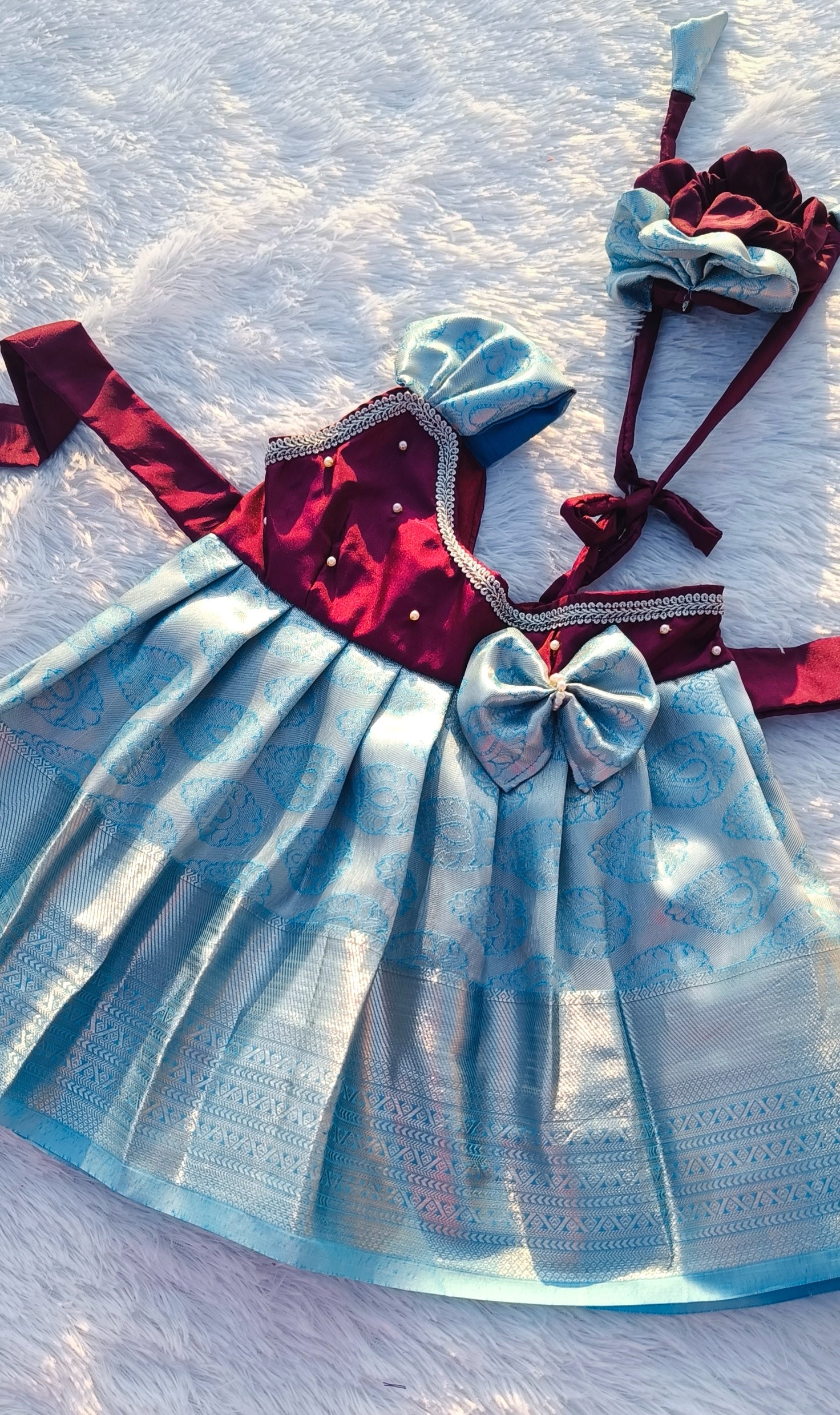 Pattu Pavadai is a traditional dress of South India. The paavadai or langa is a cone-shaped, long skirt that is pleated and tied around the waist, normally made of silk, that hangs down from the waist to the toes.