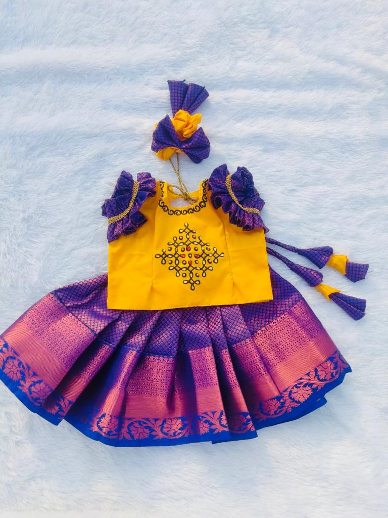 Pattu Pavadai is a traditional dress of South India. The paavadai or langa is a cone-shaped, long skirt that is pleated and tied around the waist, normally made of silk, that hangs down from the waist to the toes.