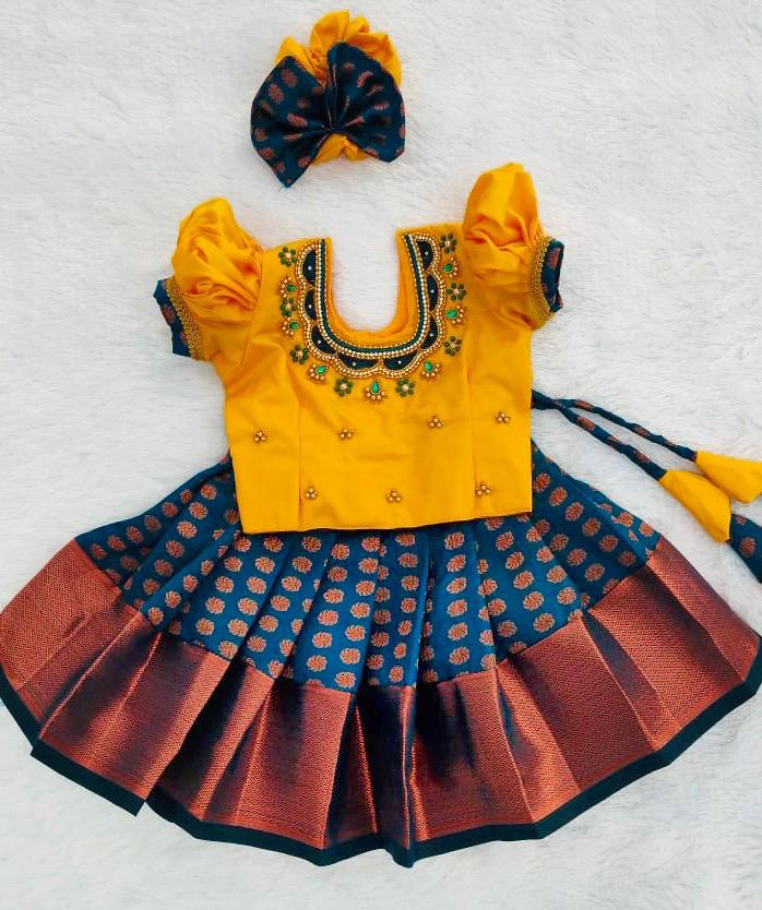 Pattu Pavadai is a traditional dress of South India. The paavadai or langa is a cone-shaped, long skirt that is pleated and tied around the waist, normally made of silk, that hangs down from the waist to the toes.