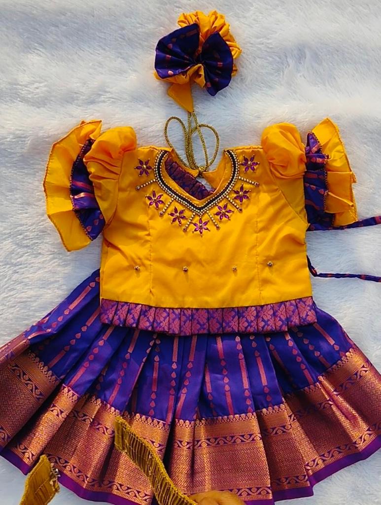 Pattu Pavadai is a traditional dress of South India. The paavadai or langa is a cone-shaped, long skirt that is pleated and tied around the waist, normally made of silk, that hangs down from the waist to the toes.