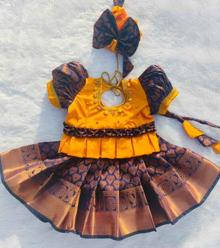 Pattu Pavadai is a traditional dress of South India. The paavadai or langa is a cone-shaped, long skirt that is pleated and tied around the waist, normally made of silk, that hangs down from the waist to the toes.